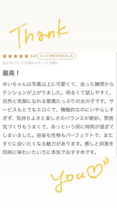 - 顔面国宝級の美女と思っていても性格は親しみやすく、かわいい見た目と愛嬌たっぷりな内面にテンションがアップしてしまいます。すこし遠いエリアからでも通いたくなるほどプレイも完璧で、おわったあとも映画をみたりいちゃいちゃしたり彼氏気分を味わってください。攻めも受けどっちも楽しめるサービス精神もたっぷりだから、180分で指名したとしても延長したくなるくらい虜になってしまうかも。